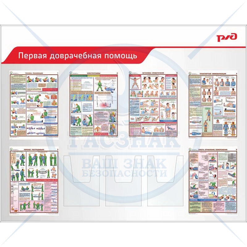 Стенды по охране труда для ОАО РЖД Оказание первой доврачебной помощи, перекидная система А2, с комплектом плакатов А2 (Пластик ПВХ 4 мм; 850х1100)