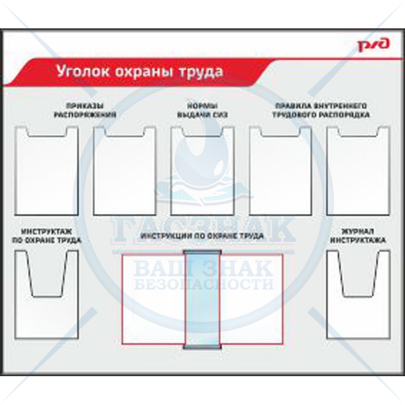 Стент РЖД Уголок охраны труда Пластик ПВХ 4 мм 900х900 (профиль алюминевый, 3 объемных кармана А4, 3 плоских кармана А4) (900х900; Пластик ПВХ 4 мм , пленка самоклеющаяся, алюминиевый профиль; Алюминиевый профиль)
