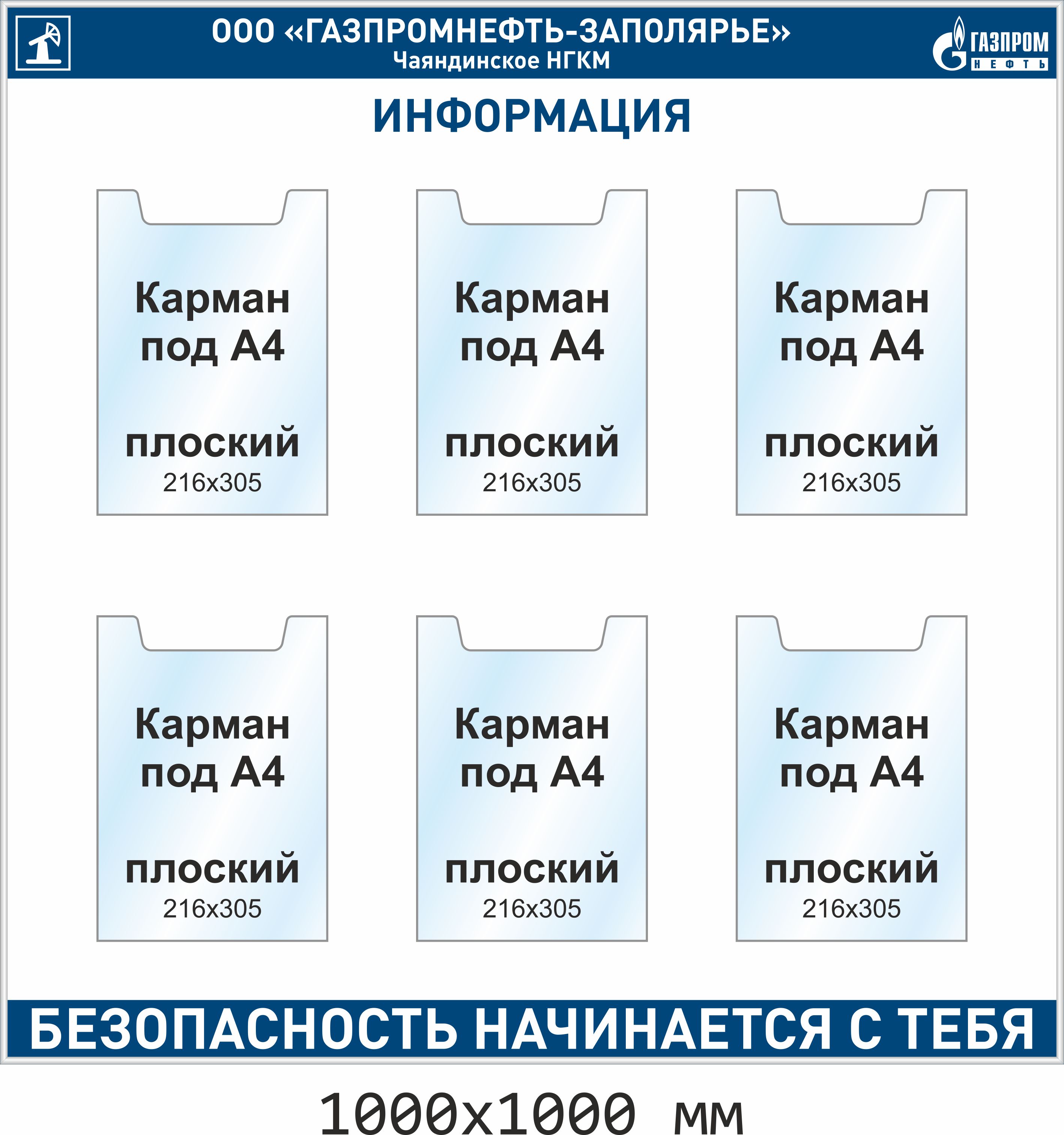 Стенд Информация. Карманы А4х6шт, логотип (1000х1000; Пластик ПВХ 4 мм, пластиковый профиль; Пластиковый)