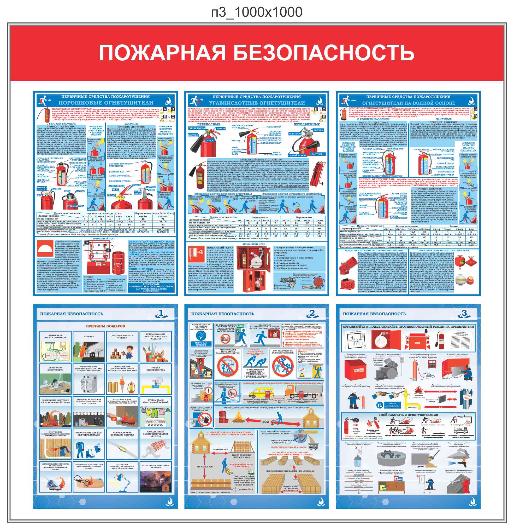 Стенд Пожарная безопасность, 6 плакатов А3 (1100х1100; Пластик ПВХ 4 мм, алюминиевый профиль; )